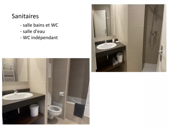Salle de bains : lavabo, baignoire et WC.
