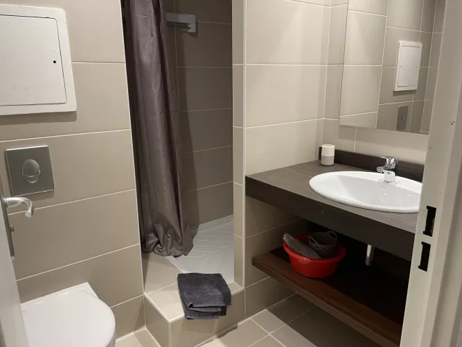 Salle d'eau : lavabo, douche, WC et sèche cheveux.