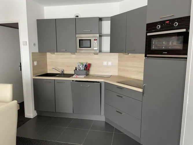 Cuisine américaine : frigo avec bac conservateur, plaque vitro 4 feux, four, micro-ondes, lave-vaisselle, cafetière à filtre, grille pain, bouilloire, robot.