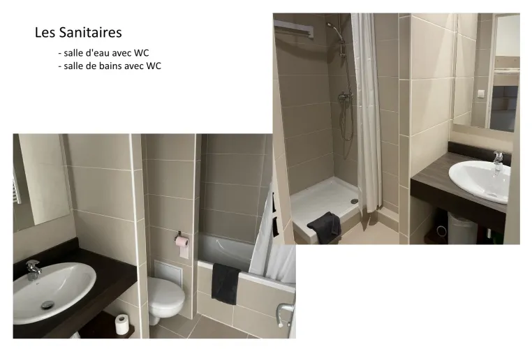 Salle d'eau : douche, lavabo, WC et sèche cheveux.