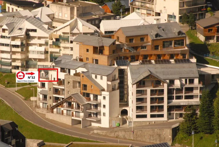 Résidence LE PORTILLO avec piscine, appartement 3 pièces pour 8 personnes, de 62 m², exposé Sud-Ouest, vue montagne et station, au 3°étage avec terrasse.