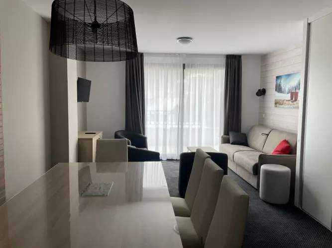 De nombreux services sont inclus: piscine intérieure chauffée avec bain à bulles et bassin pour enfants, salle de sport, salle de jeux, local à skis avec sèche-chaussures individuels et connexion Wi-Fi gratuite.