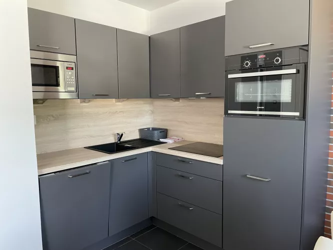 Cuisine américaine : frigo avec bac conservateur, plaque vitro 4 feux, four, micro-ondes, lave-vaisselle, cafetière à filtre, bouilloire, grille-pain, robot.