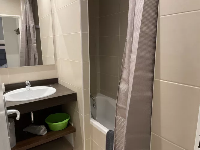Salle de bain : lavabo, baignoire et sèche-cheveux. WC indépendant.