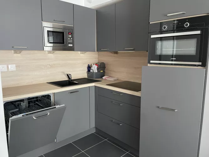 Cuisine américaine : frigo avec bac conservateur, plaque vitro 4 feux, four, micro-ondes, lave-vaisselle, cafetière à filtre, grille-pain, bouilloire, robot.