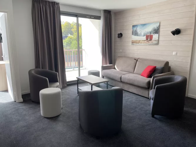 Résidence LE PORTILLO avec piscine, appartement 2 pièces pour 8 personnes, de 66m², exposé Sud-Ouest, vue montagne et station, au 3°étage avec terrasse.