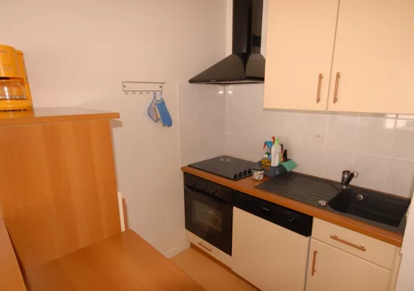Cuisine: plaque vitro 4 feux, four, frigo, lave-vaisselle, micro-ondes, cafetière filtre, grille pain, robot.