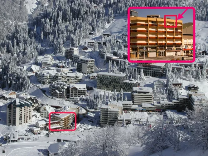 Résidence LES MARMOTTES, studio confort pour 4/5 personnes, 4°étage, vue pistes, 29m², exposé Sud-Est, placard à ski, chauffage électrique.