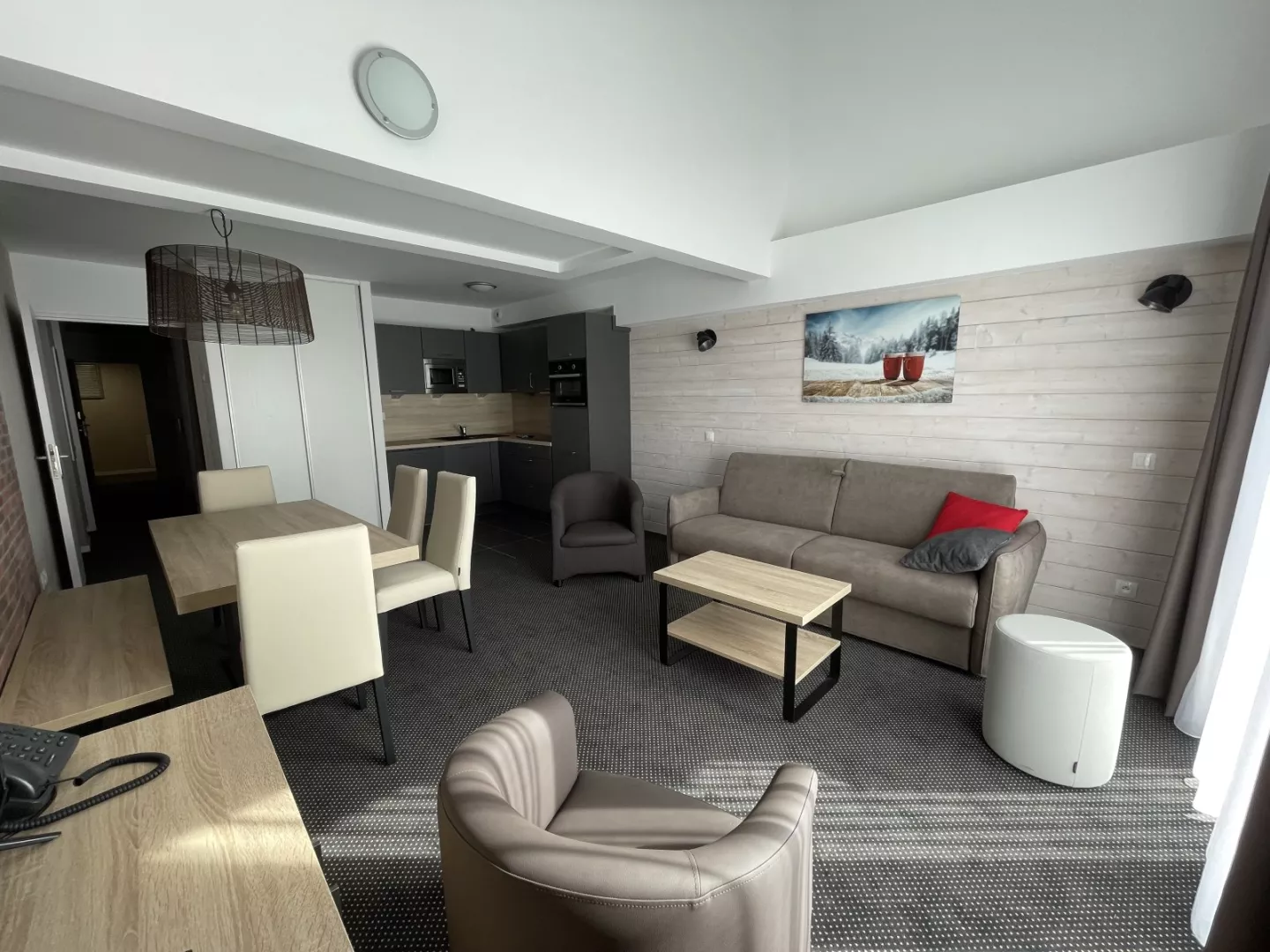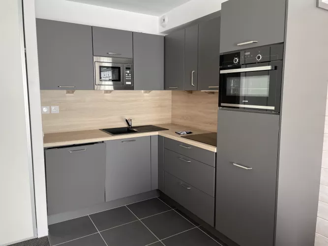 Cuisine américaine : frigo avec bac conservateur, plaque vitro 4 feux, four, micro-ondes, lave-vaisselle, cafetière à filtre, grille-pain, bouilloire, robot.