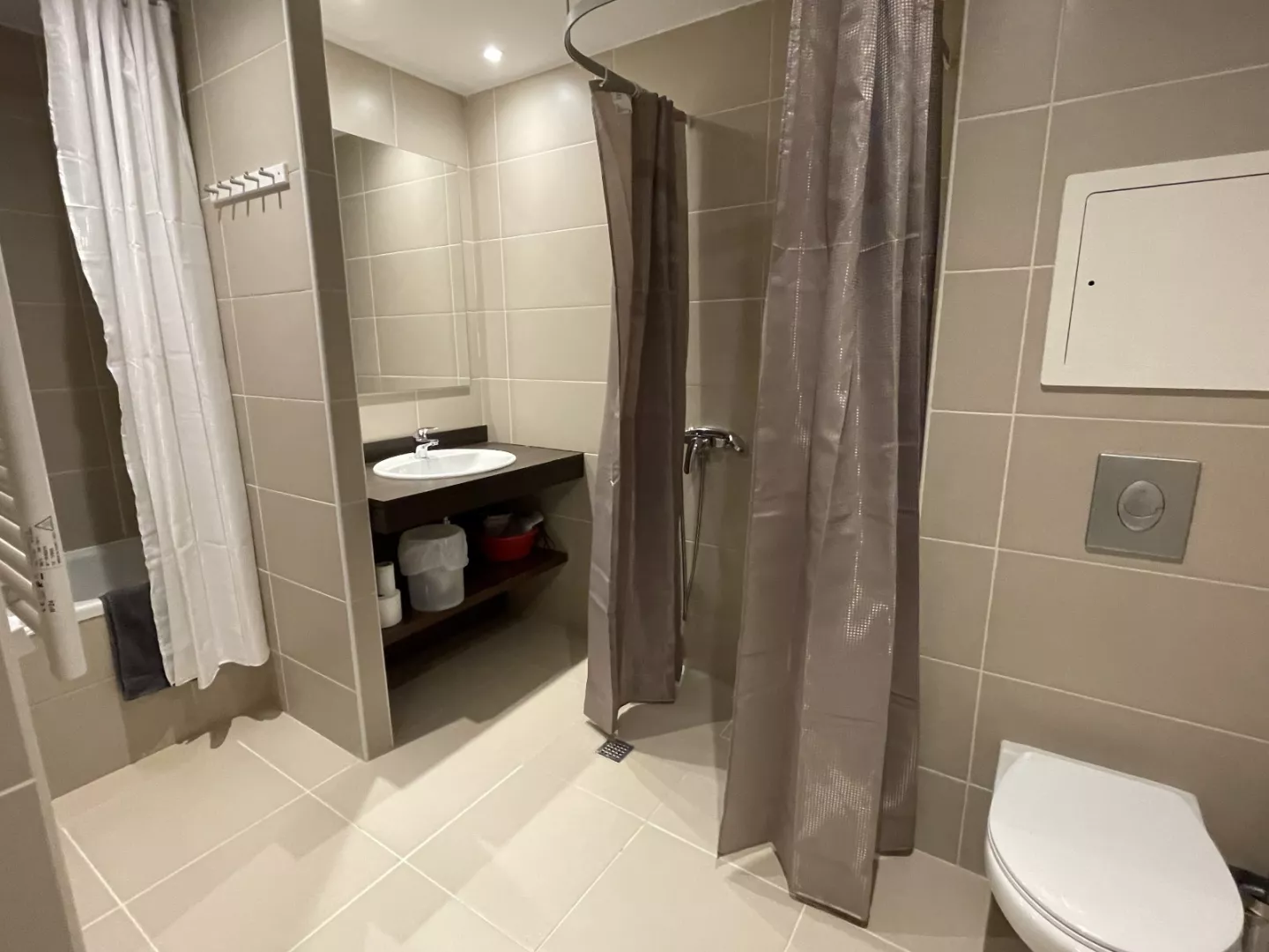 Salle de bain : baignoire, lavabo, WC et sèche-cheveux.