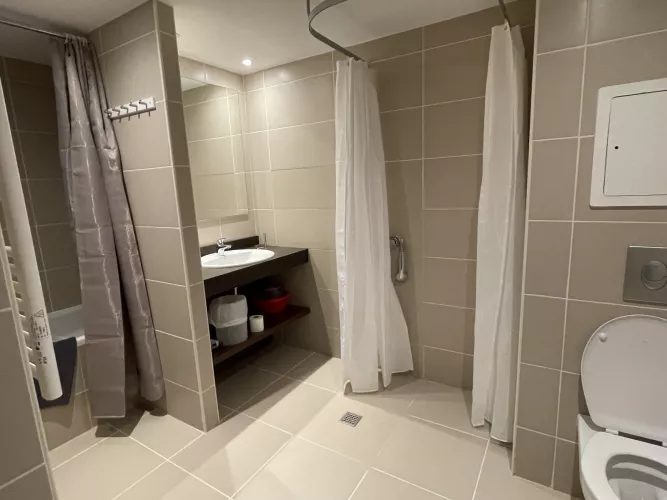 Salle de bain : baignoire, lavabo, WC et sèche-cheveux.