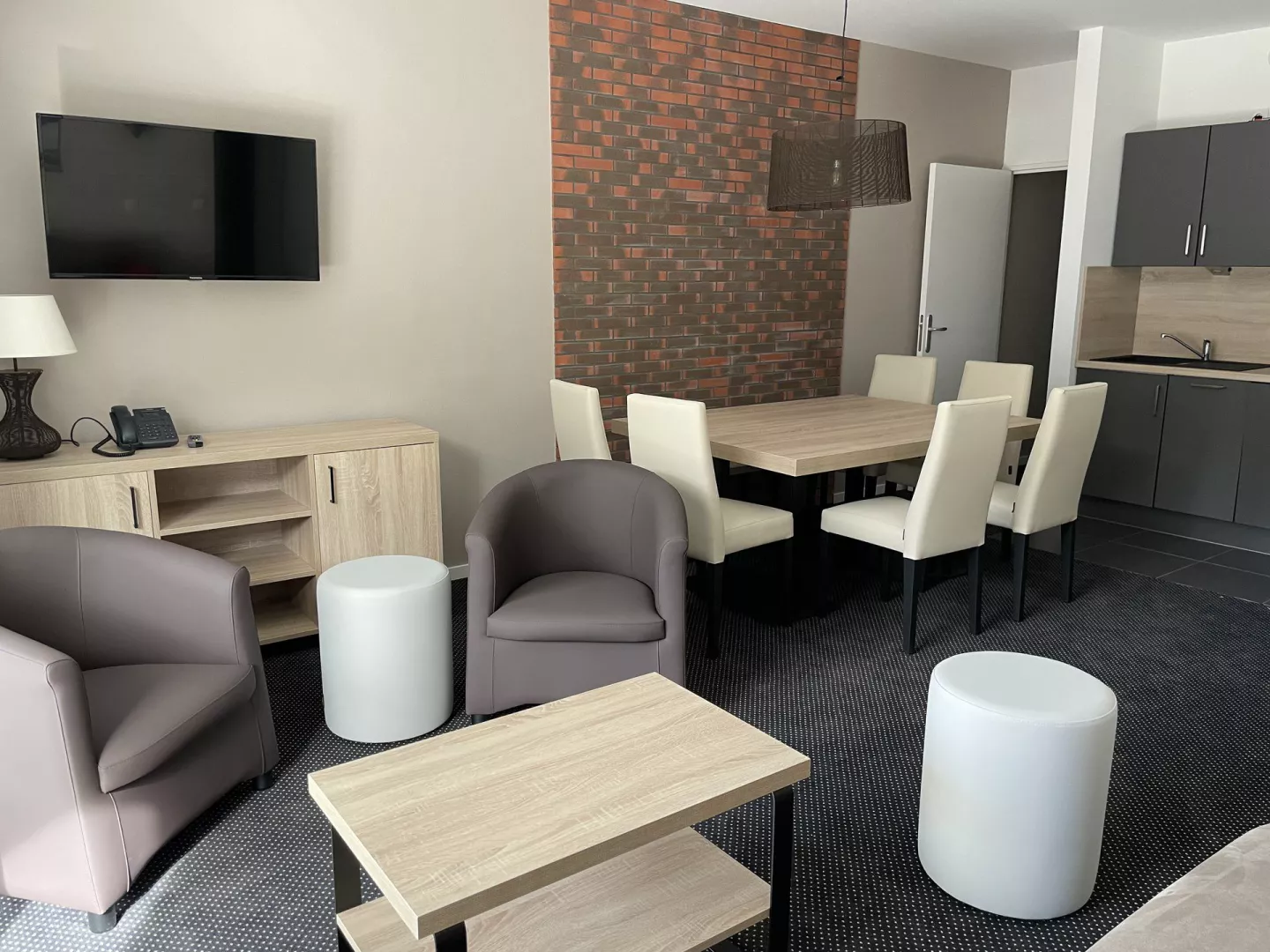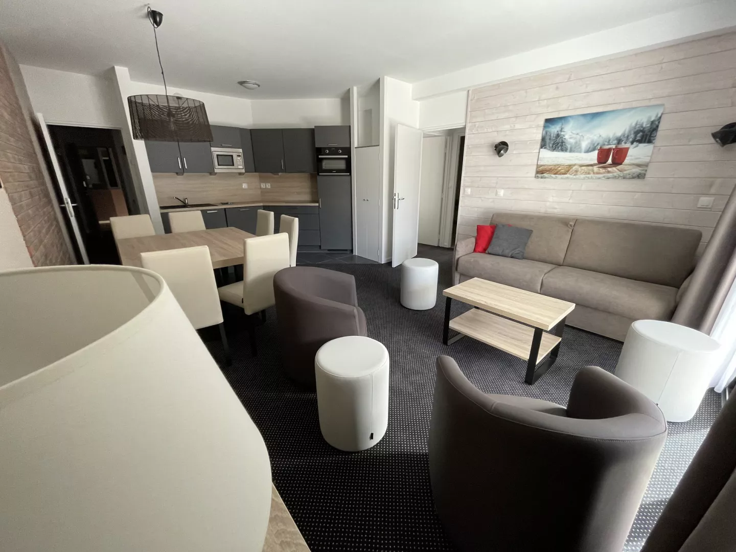 Cuisine américaine : frigo avec bac conservateur, plaque vitro 4 feux, four, micro-ondes, lave-vaisselle, cafetière à filtre, grille pain, bouilloire robot.
