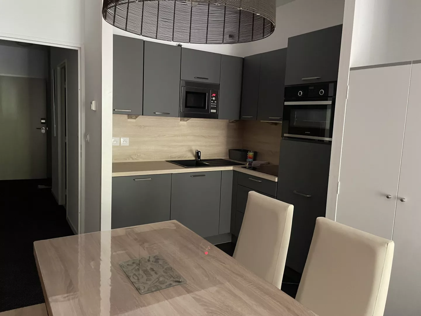 Cuisine américaine : frigo avec bac conservateur, plaque vitro 4 feux, four, micro-ondes, lave-vaisselle, cafetière à filtre, grille-pain, bouilloire, robot.