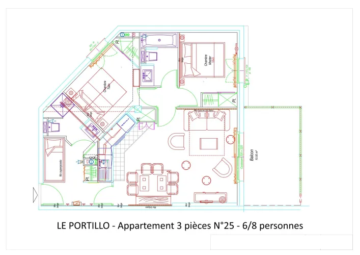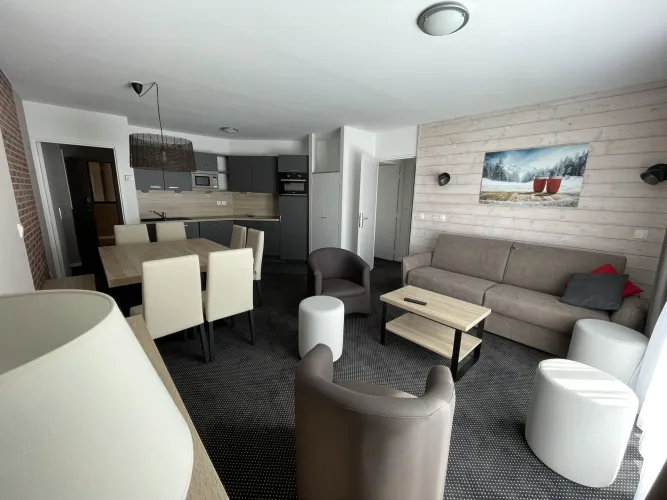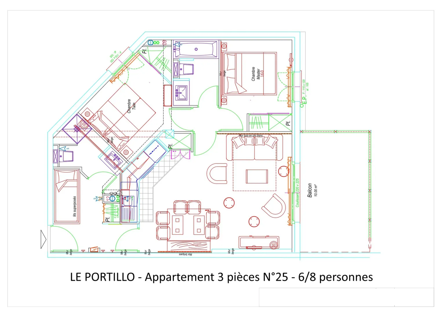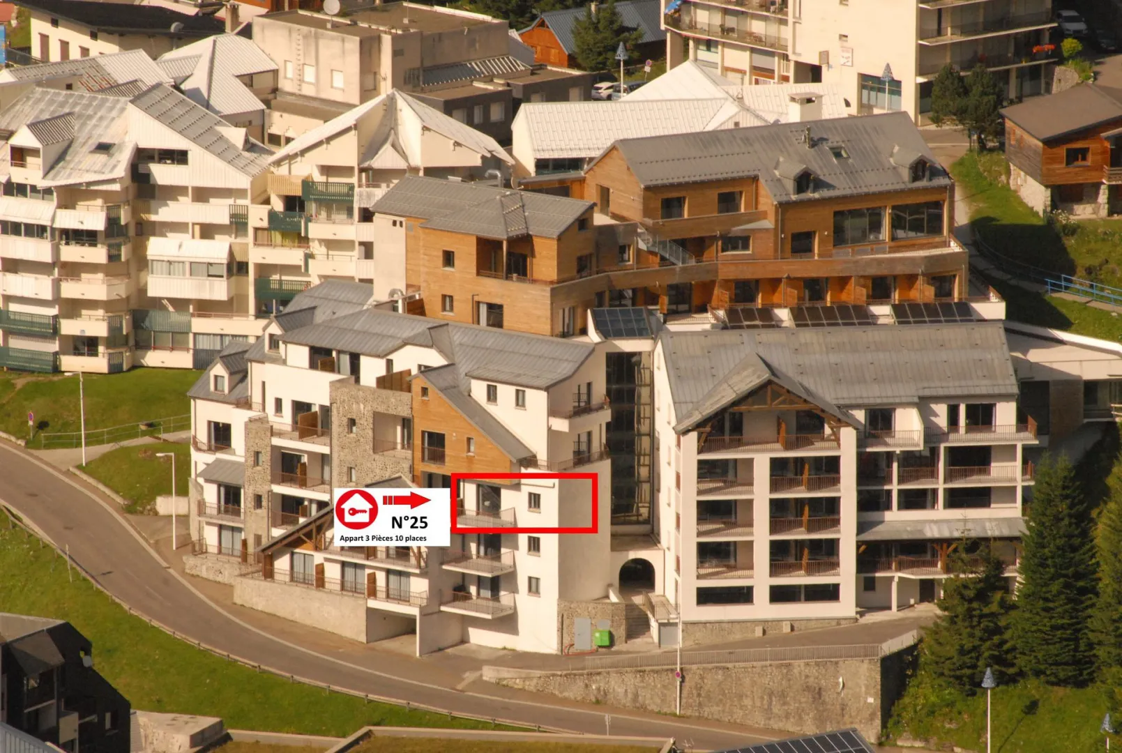 Résidence LE PORTILLO avec piscine, appartement 3 pièces pour 6/8 personnes, de 61m², exposé Sud-Ouest, vue pistes et station, au 2°étage avec terrasse.