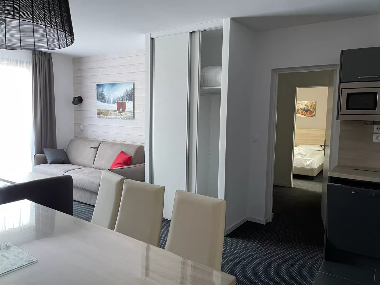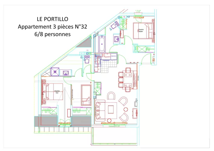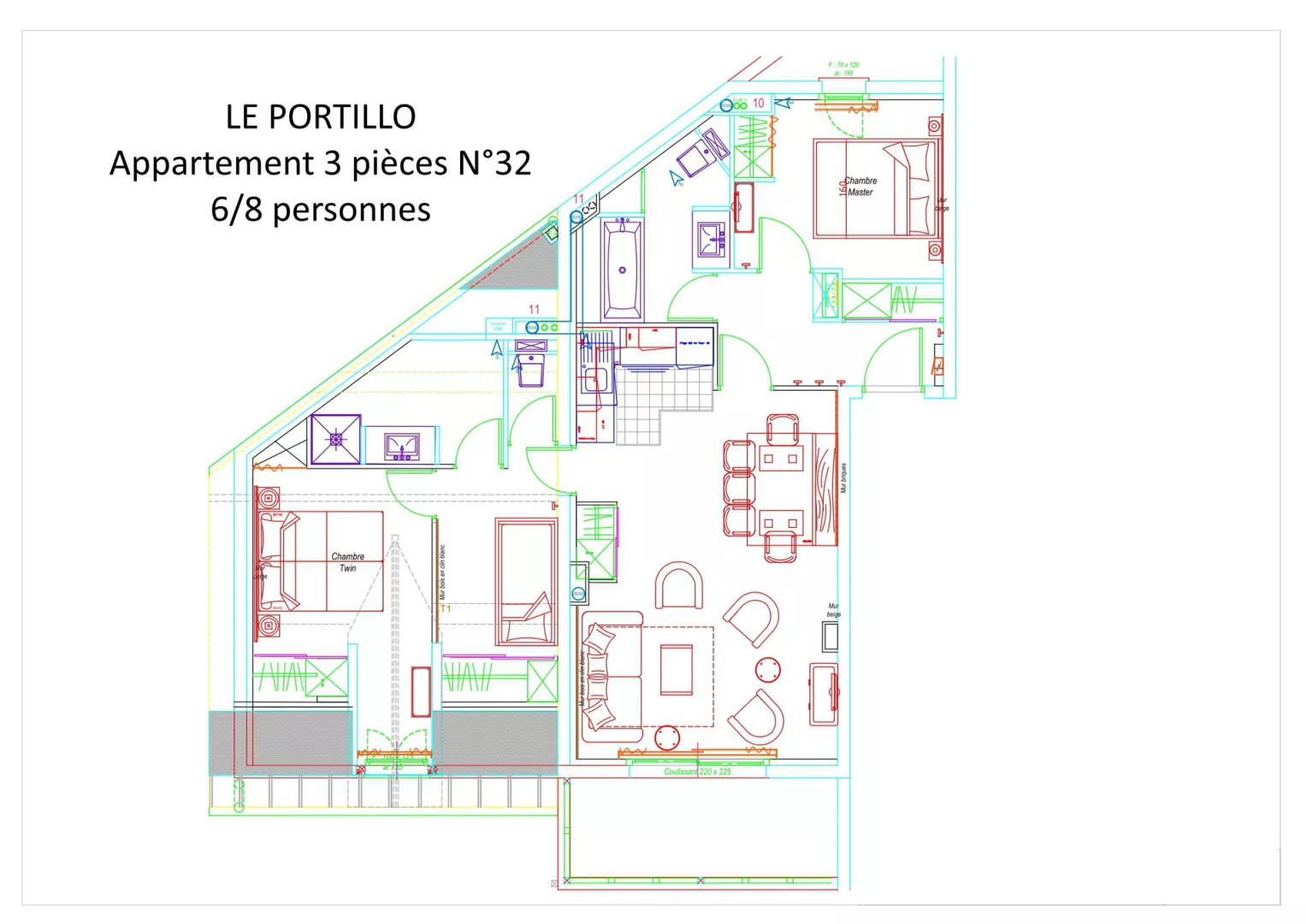 Résidence LE PORTILLO avec piscine, appartement 3 pièces pour 8 personnes, de 62 m², exposé Sud-Ouest, vue montagne et station, au 3°étage avec terrasse.