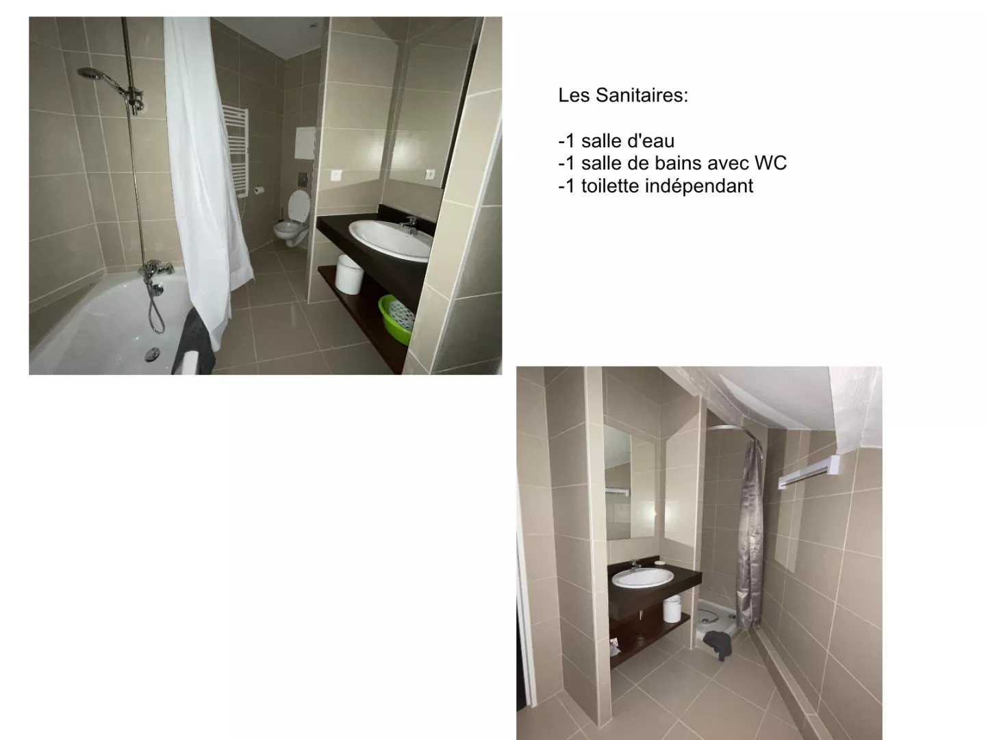 Salle de bains : baignoire, lavabo, WC, et sèche-cheveux.