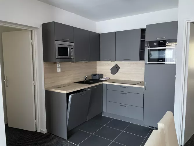 Cuisine américaine : frigo avec bac conservateur,plaque vitro 4 feux, four, micro-ondes, lave-vaisselle, cafetière à filtre, grille pain, bouilloire, robot.