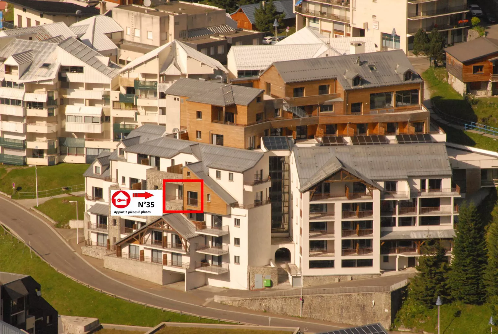 Résidence LE PORTILLO avec piscine, appartement 2 pièces pour 8 personnes, de 66m², exposé Sud-Ouest, vue montagne et station, au 3°étage avec terrasse.