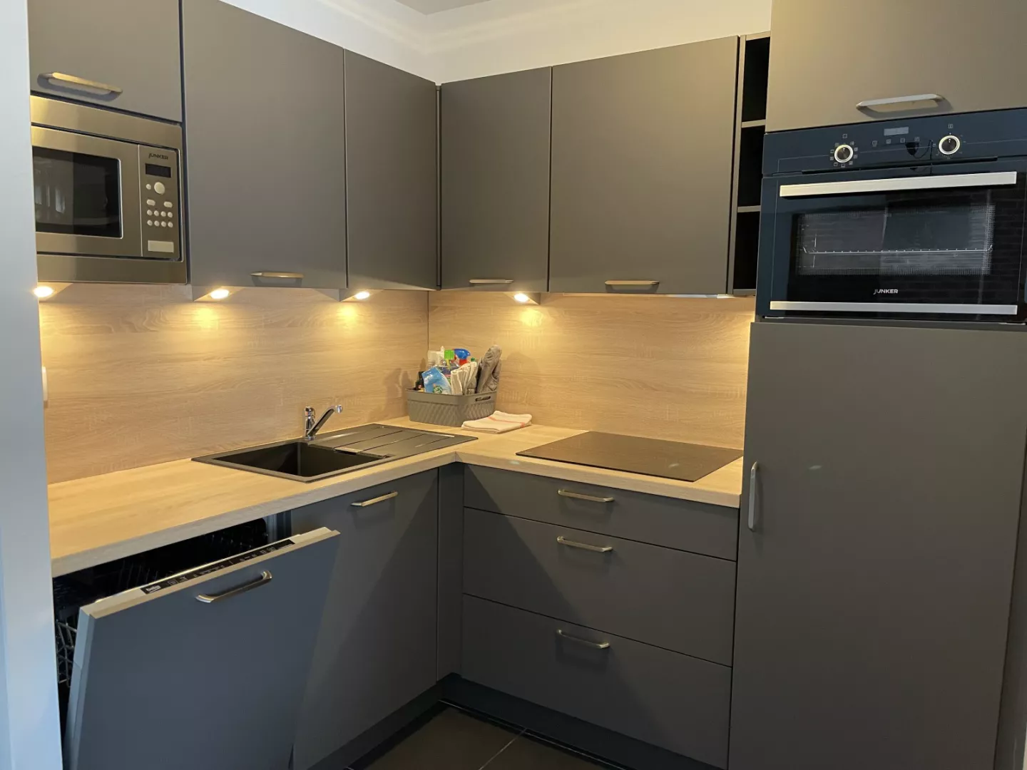 Cuisine américaine : frigo avec bac conservateur, plaque vitro 4 feux, four, micro-ondes, lave-vaisselle, cafetière à filtre, grille-pain, robot.