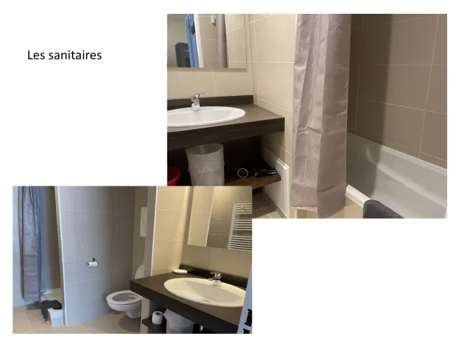 Salle de bains : lavabo, baignoire et sèche-cheveux. WC indépendant.