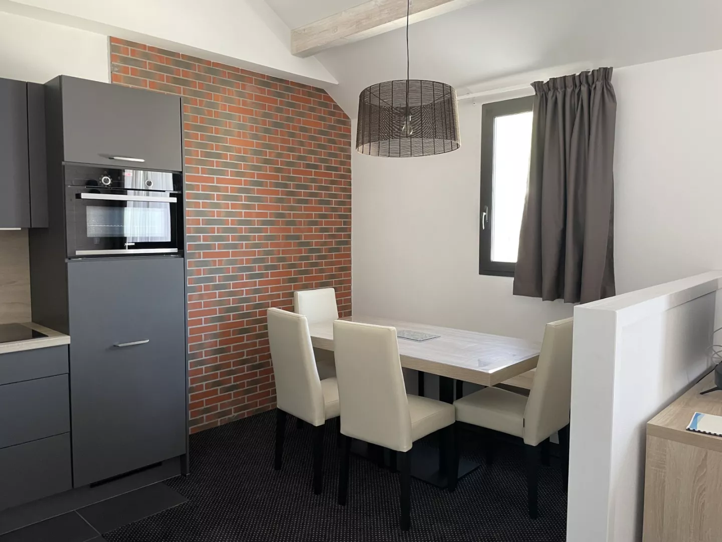 Cuisine américaine : frigo avec bac conservateur, plaque vitro 4 feux, four, micro-ondes, lave-vaisselle, cafetière à filtre, bouilloire, grille-pain, robot.
