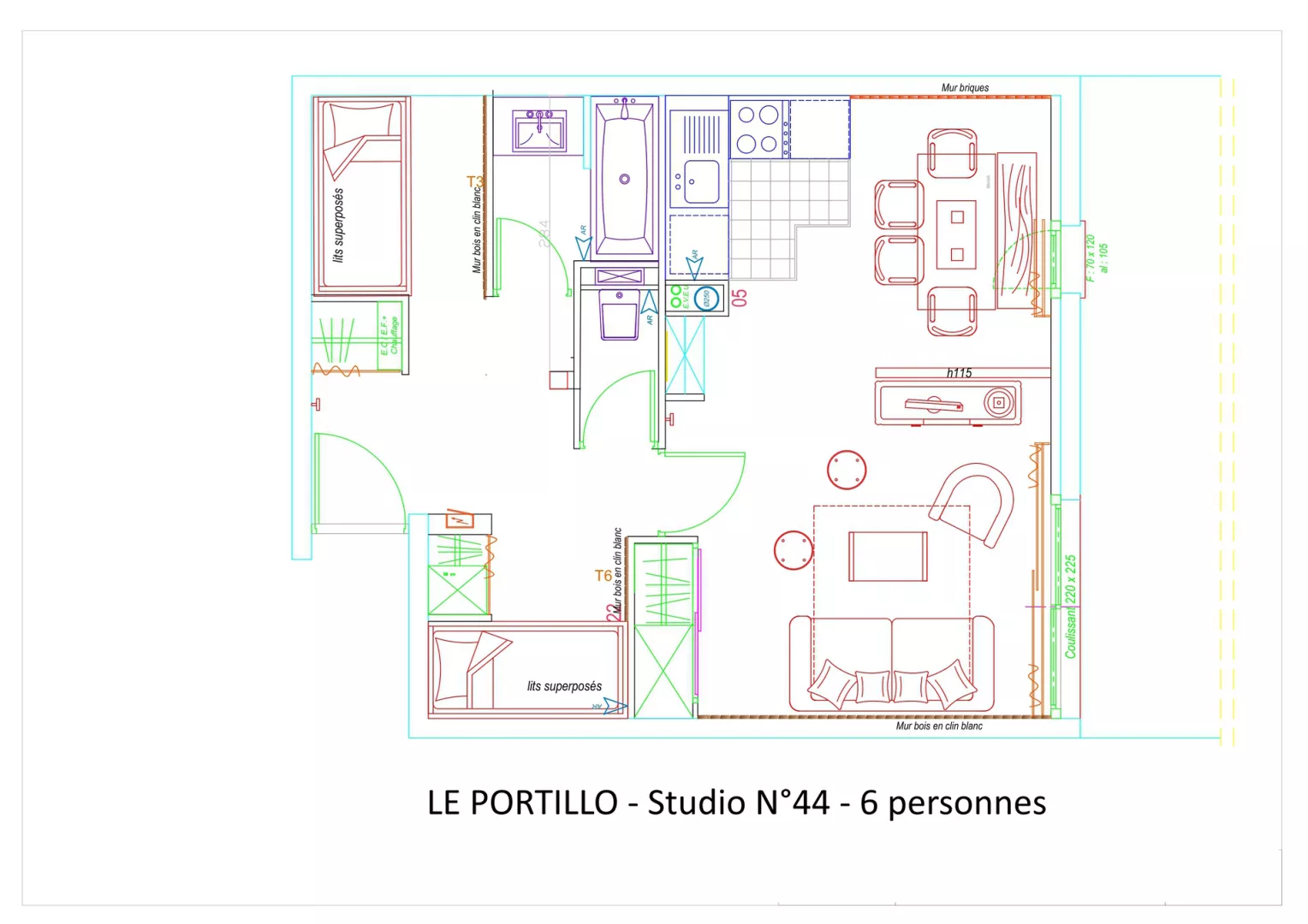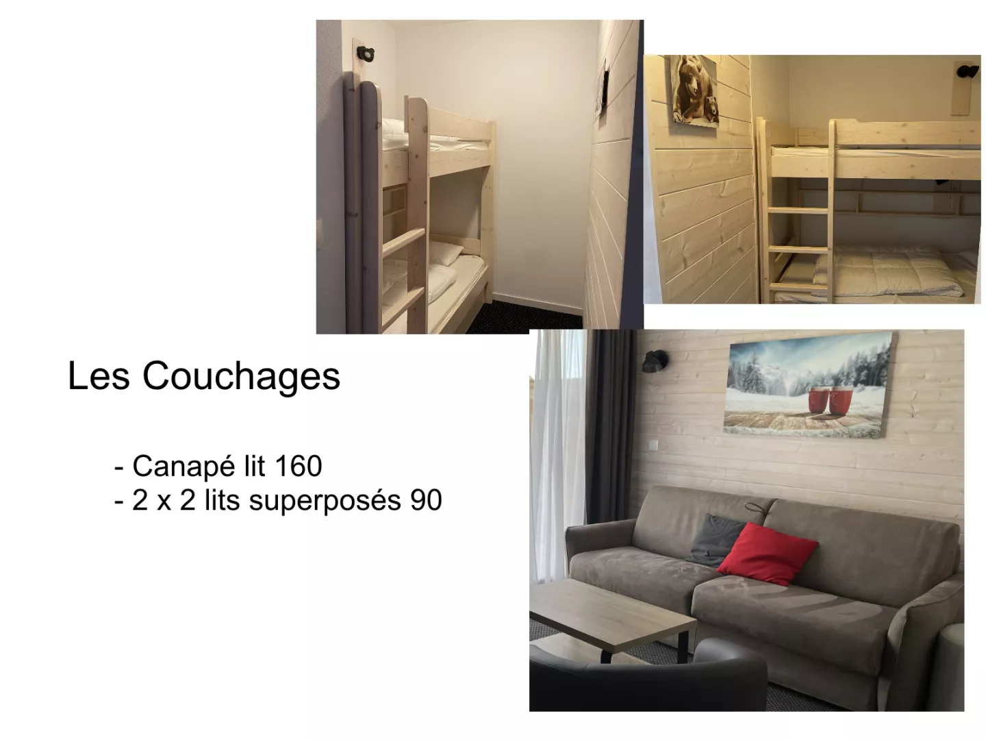 Entrée : 2 coins montagne avec chacun 2 lits superposés en 90.