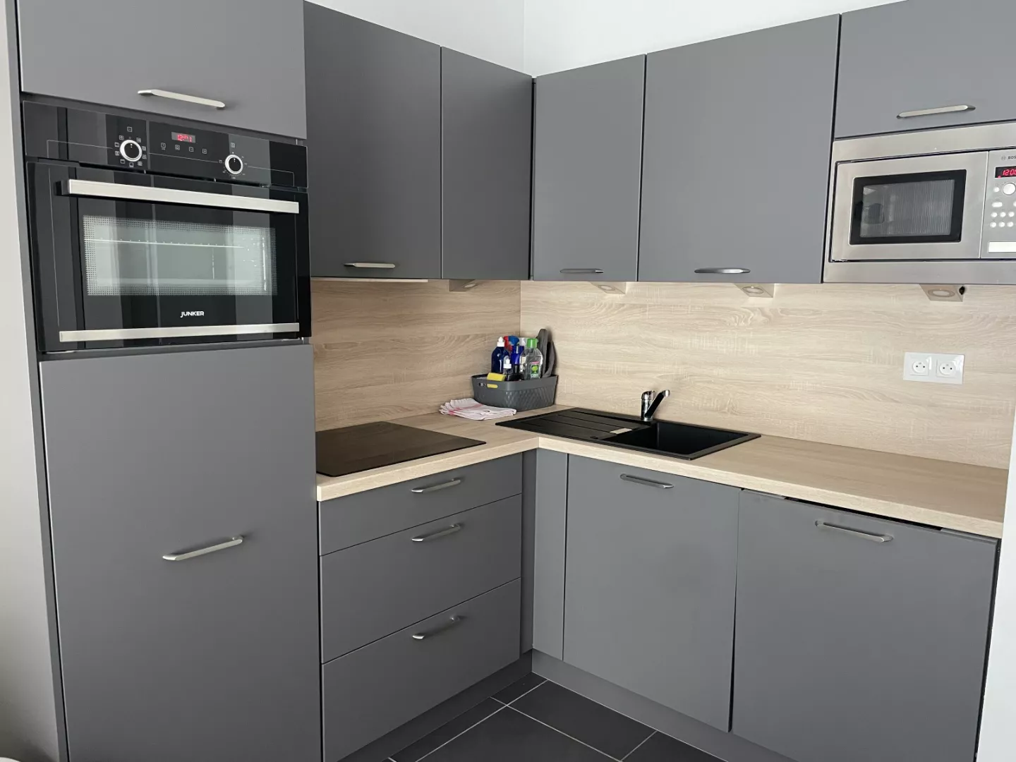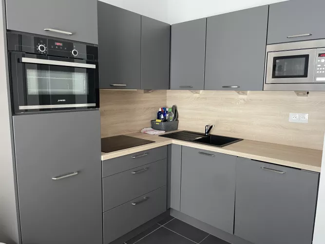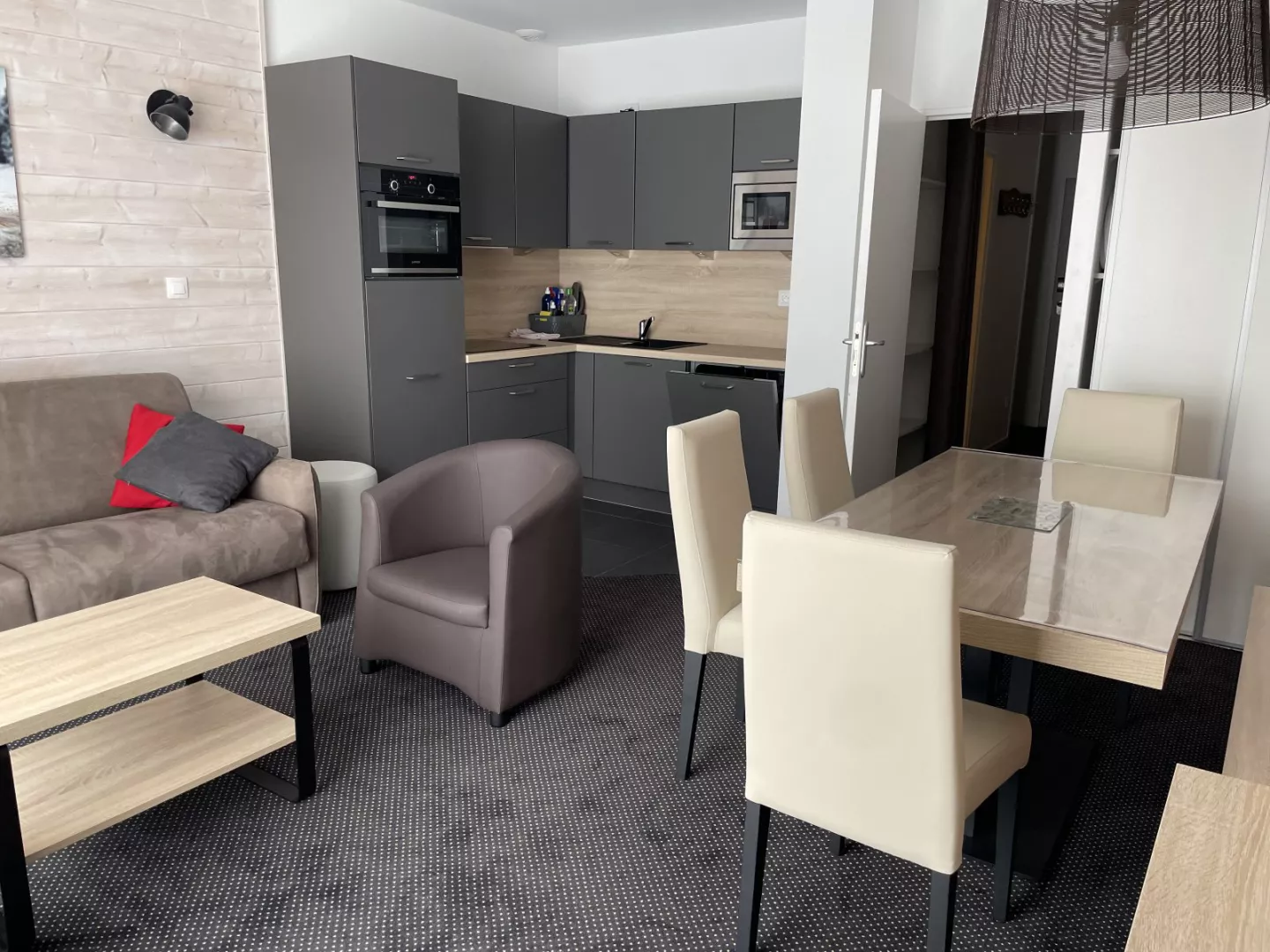 Cuisine américaine : frigo avec bac conservateur, plaque vitro 4 feux, four, micro-ondes, lave-vaisselle, cafetière filtre, grille-pain, bouilloire, robot.