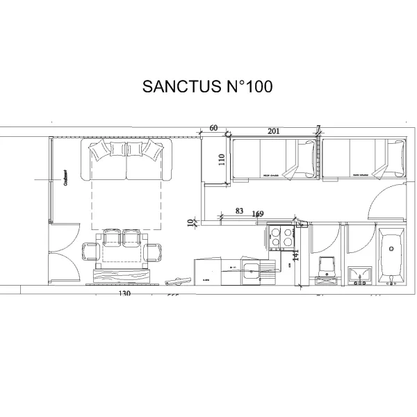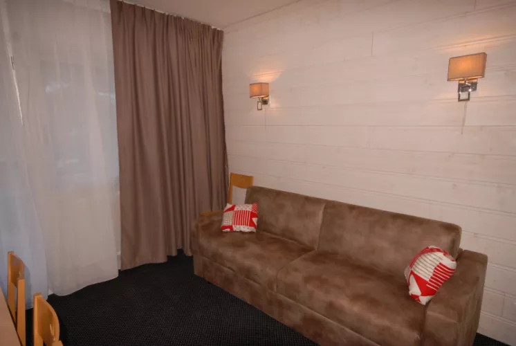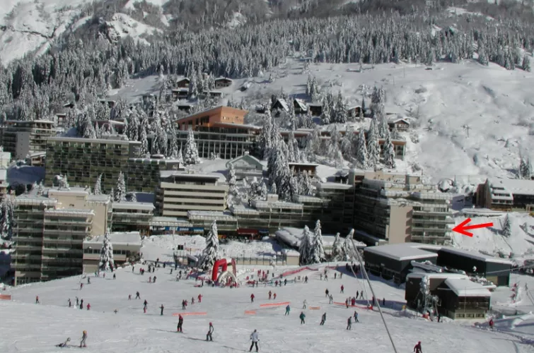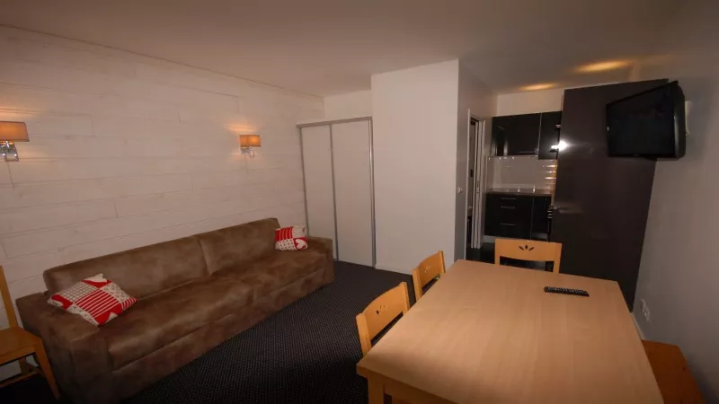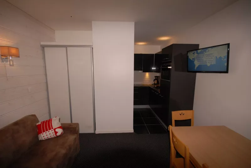 Résidence SANCTUS, studio confort pour 6 personnes, 4°étage, vue montagne, 28m², exposé Est, terrasse, chauffage collectif.