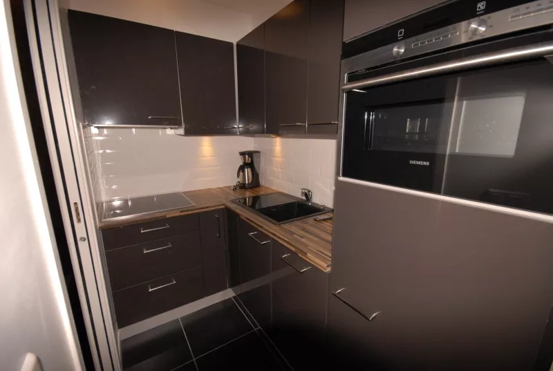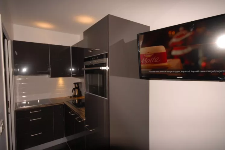 Cuisine : plaque vitro 4 feux, four combiné micro-ondes, frigo avec bac conservateur, lave-vaisselle, cafetière filtre, grille pain.