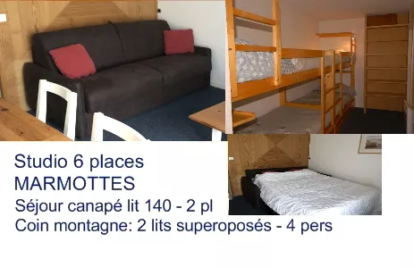 Résidence LES MARMOTTES, studio confort pour 6 personnes, 3°étage, vue pistes, 29m², exposé Sud-Est, placard à ski, chauffage électrique.