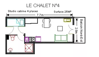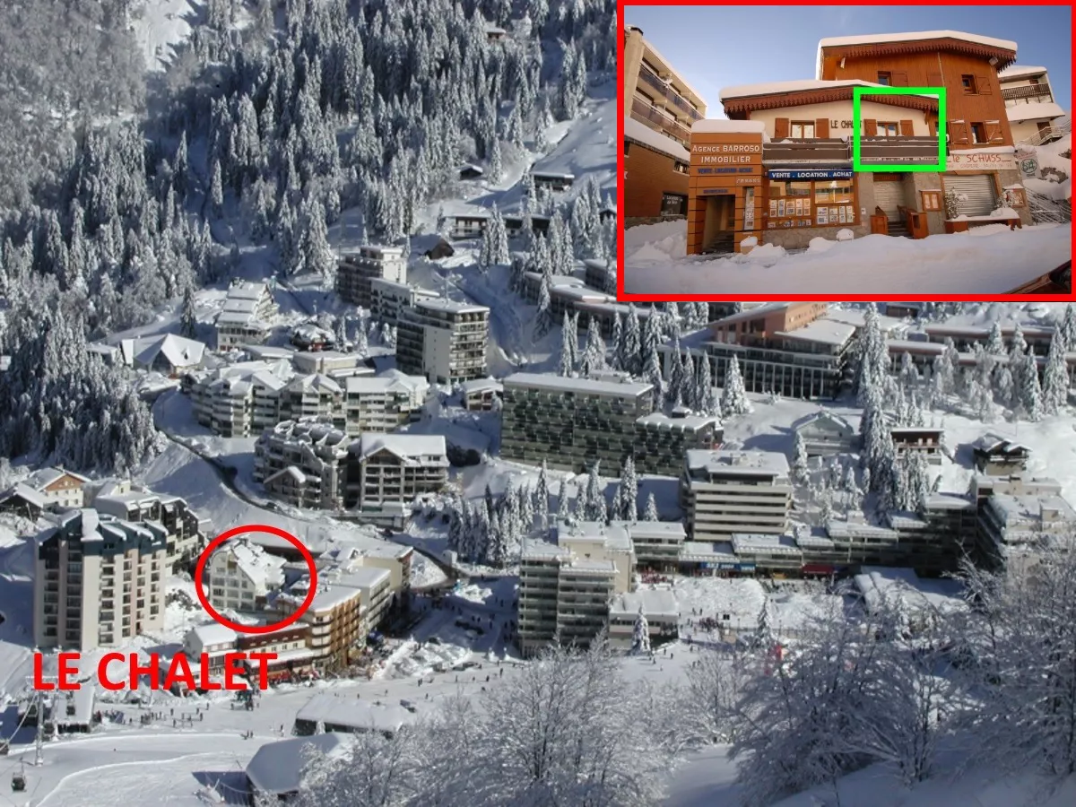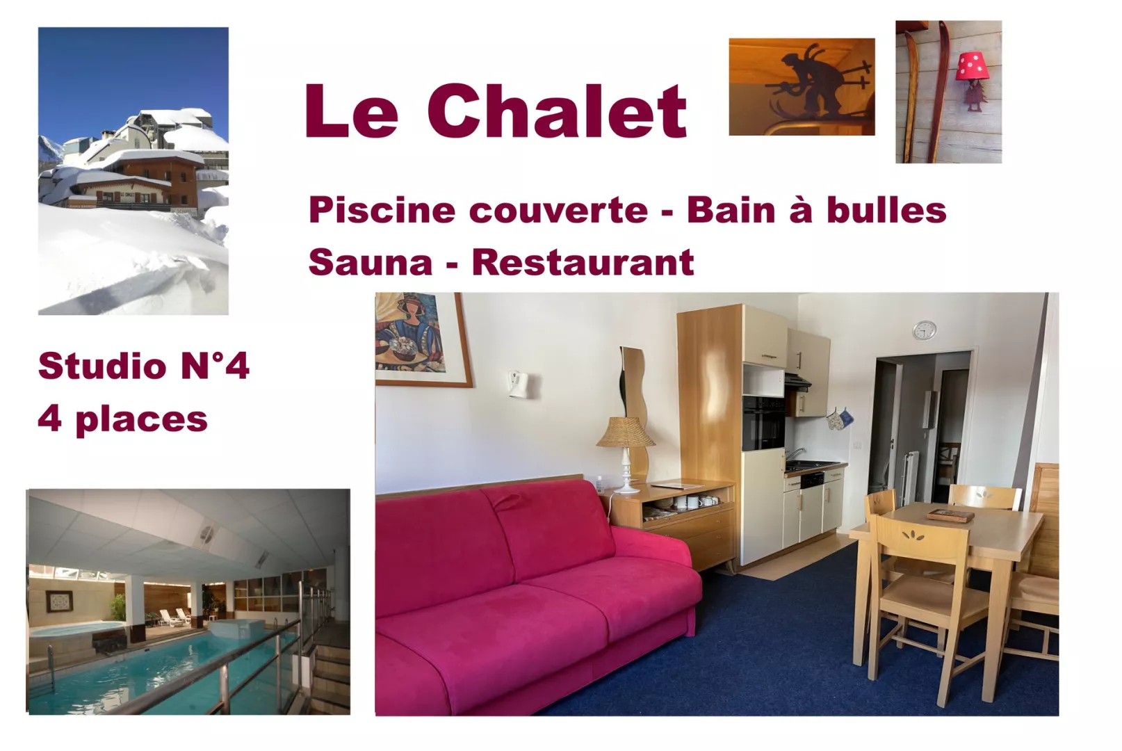 Résidence LE CHALET avec piscine, studio pour 4 personnes, 1er étage, vue station, 25m² , expo nord-est, balcon, placard à ski chauffant, chauffage central.