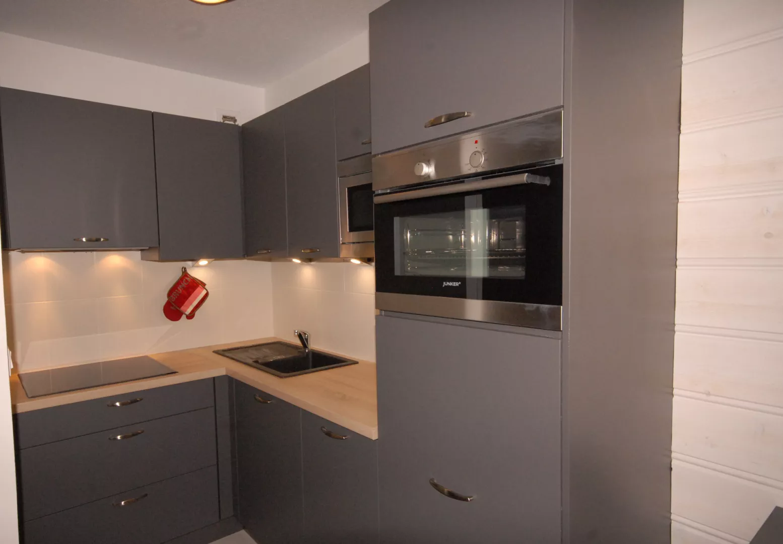 Cuisine: plaque 4 feux, four combiné micro-ondes, lave-vaisselle, frigo bac conservateur, cafetière filtre, grille pain.