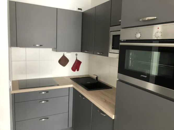 Séjour avec cuisine équipée et canapé lit 2 places, balcon.